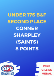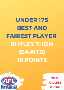 In the under 17s, Inverell’s Rhyley Thom, 10 points, was named the best and fairest player ahead of fellow Saints player Conner Sharpley, eight points, and Tamworth’s Jack Dadd, six points.