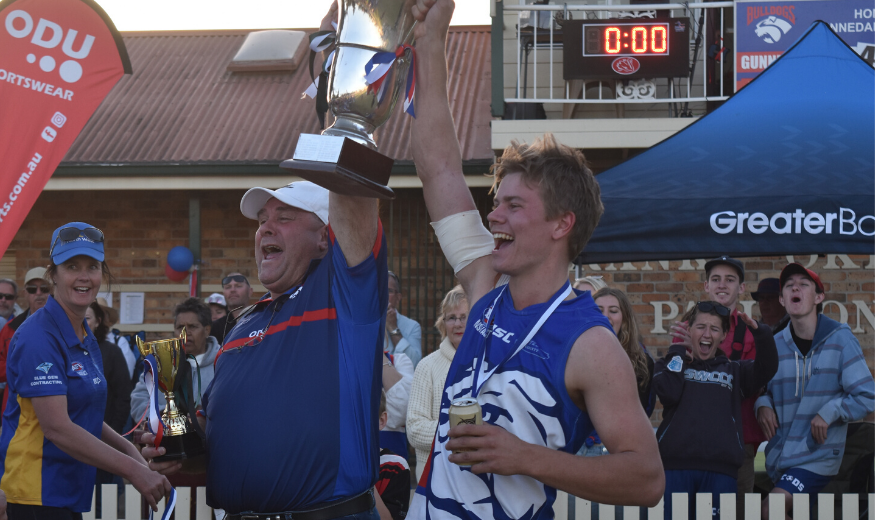 Coach Doug Meagher and captain Ben Maher celebrate the 2020 premiership. Image courtesy of The Northern Daily Leader