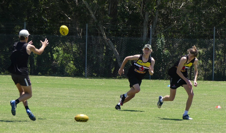 The session started with video review looking at footage from NAB League (Under 18) matches to show the players the sorts of skills and playing style the Heat program will look to develop. The key focal areas are to use handball combinations to keep the ball moving forward whilst players hunt as a pack. The remainder of the session saw the players start to put these philosophies into practice through various drills designed to build to this style.