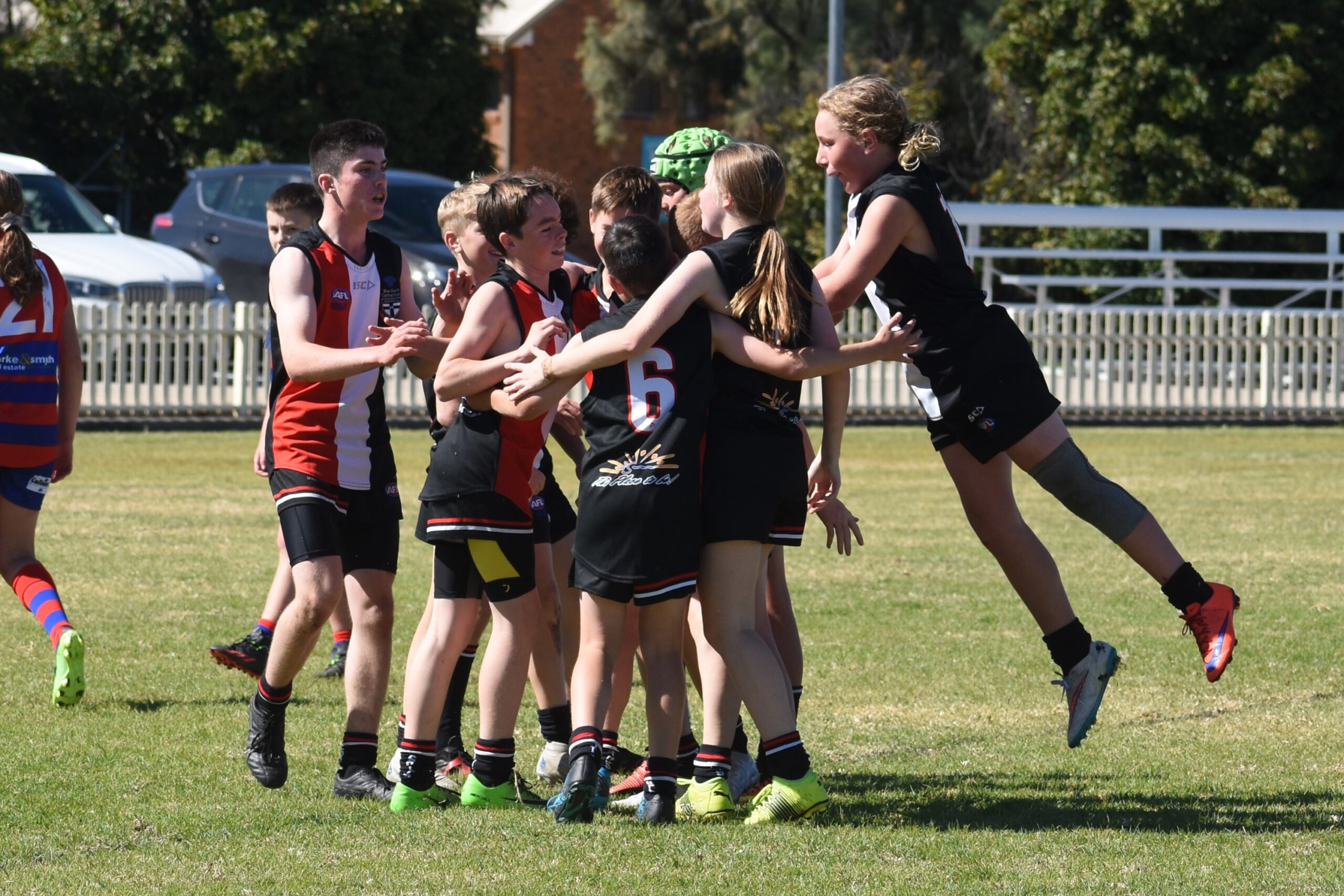 Inverell's Under 14s players celebrate after the final siren sounded in the 2023 Grand Final at Valley Oval.